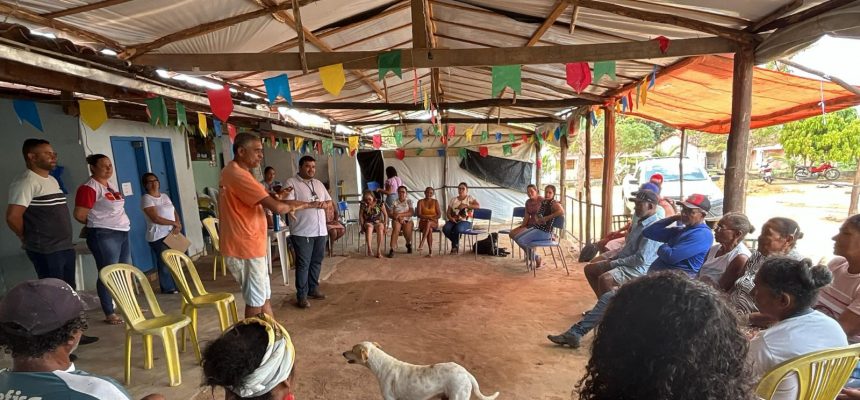 Grupo de pessoas reunidas em círculo sob uma estrutura coberta, com cadeiras plásticas ao redor, algumas pessoas em pé falando ao grupo e um cachorro no centro do espaço. Bandeirolas coloridas estão penduradas no teto.No período de 10 anos, foram doados 89 bens, entre máquinas e equipamentos, para associações de 17 municípios de Alagoas. A lista inclui tratores agrícolas, grandes aradoras, carretas agrícolas, batedeira de cereais, sulcador agrícola, microtratores, plantadeiras/adubadeiras, roçadeiras agrícolas, colhedoras de forragem, plantadeira de grãos, entre outros itens.