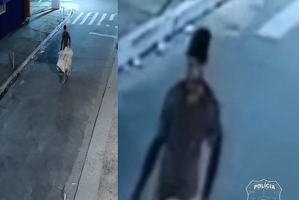 O suspeito aparece empurrando um carro de mão com um volume grande nele.