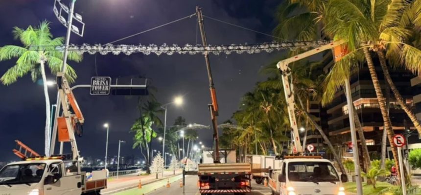 A Prefeitura de Maceió está na fase final de preparação para o Natal de Todos Nós 2025. Na noite desta quarta-feira (4), equipes da Autarquia Municipal de Iluminação Pública realizaram intervenções na Avenida Silvio Carlos Viana, no bairro da Ponta Verde, após as 22h. Foram instaladas estruturas metálicas que servirão de suporte para arcos de luz e para as luminárias, visando a principal via da orla.
